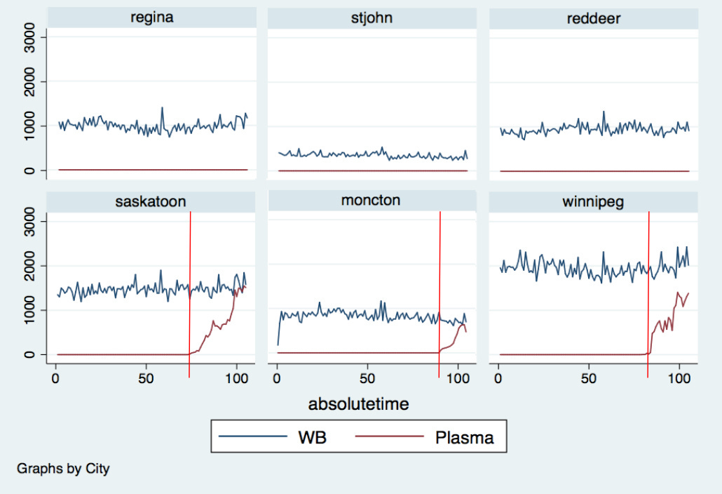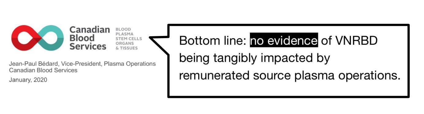 Ο συνάδελφός μου και εγώ ερευνήσαμε την κατάσταση στον Καναδά. Δεν διαπιστώσαμε καμία αρνητική επίδραση στις τρεις πόλεις όπου εισήχθησαν ιδιωτικά κέντρα συλλογής πλάσματος προς κλασματοποίηση το 2016 και το 2017. Αντίθετα, υπήρξε μια μικρή, αλλά στατιστικά σημαντική, θετική επίδραση.