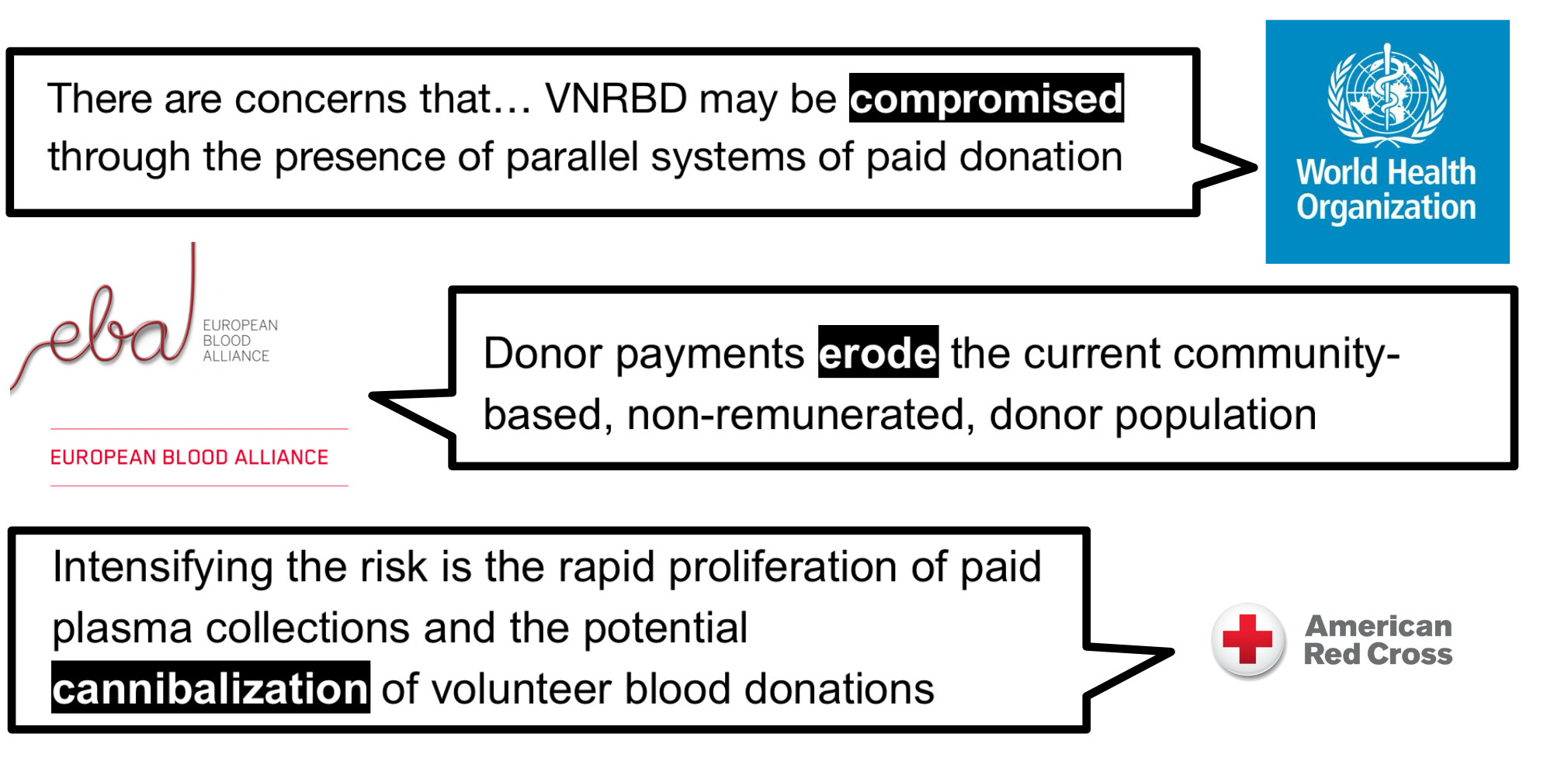 Παρόμοιες ανησυχίες έχουν διατυπωθεί και από σημαντικούς διεθνείς φορείς. Ο Παγκόσμιος Οργανισμός Υγείας, η European Blood Alliance και ο Αμερικανικός Ερυθρός Σταυρός έχουν όλοι τοποθετηθεί προς αυτή την κατεύθυνση.