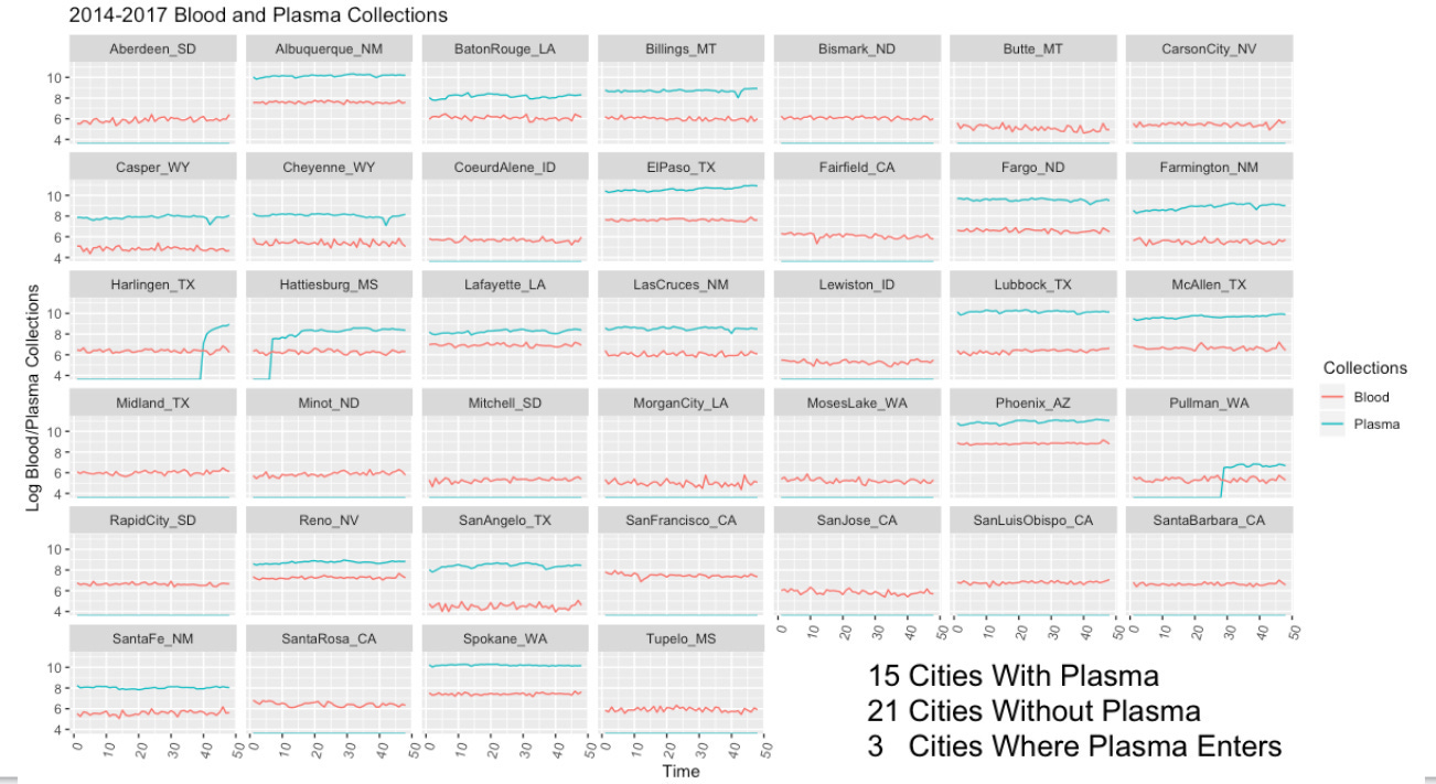 Τι διαπιστώσαμε; Οι πόλεις όπου λειτουργούσαν κέντρα συλλογής πλάσματος προς κλασματοποίηση δεν συνέλεξαν λιγότερο αίμα σε σχέση με τις πόλεις όπου δεν υπήρχε τέτοια δραστηριότητα·και οι πόλεις στις οποίες προστέθηκαν κέντρα συλλογής πλάσματος δεν εμφάνισαν καμία χειροτέρευση στις αιμοδοσίες τους.