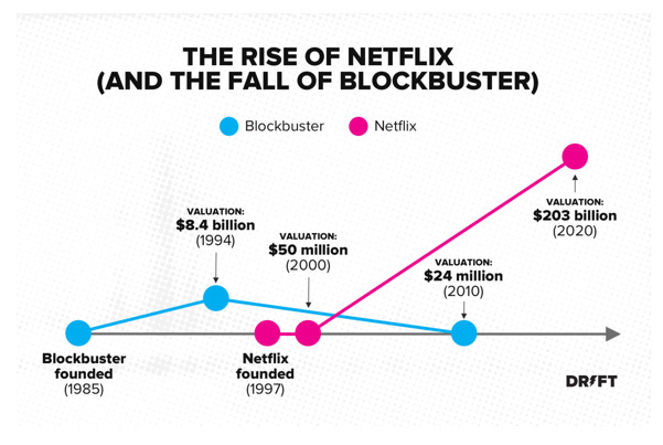 Η Blockbuster ήταν μια πολύ δημοφιλής εταιρεία ενοικίασης ταινιών. Άξιζε δισεκατομμύρια, είχε εκατομμύρια πελάτες και χιλιάδες καταστήματα όταν εμφανίστηκε η Netflix το 1997. Αλλά έπρεπε να οδηγήσεις μέχρι το κατάστημα για να νοικιάσεις τις ταινίες και να τις επιστρέψεις τρεις μέρες αργότερα, αλλιώς έπρεπε να πληρώσεις πρόστιμο καθυστέρησης.