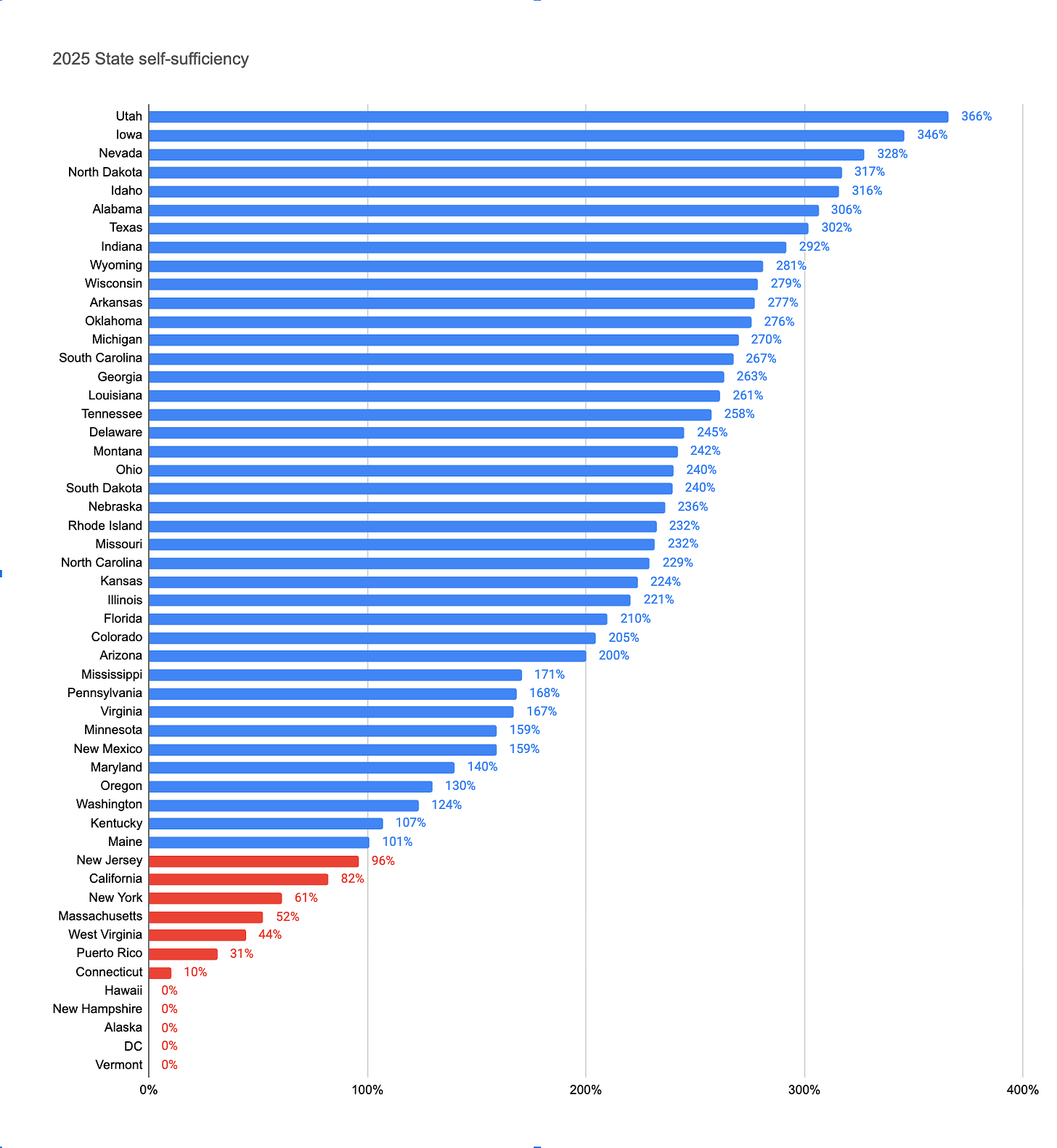 Since some states have many centers while others have few (and some have none), we can estimate state self-sufficiency. A handful of states, including large states like California, Massachusetts, and New York, do not collect enough plasma to meet their own needs. They rely on other states to make up for the difference. Again, this is due to the higher costs of collecting plasma in these states than in states like Utah and Texas, costs that are the result of historical regulatory differences, but also higher wages.