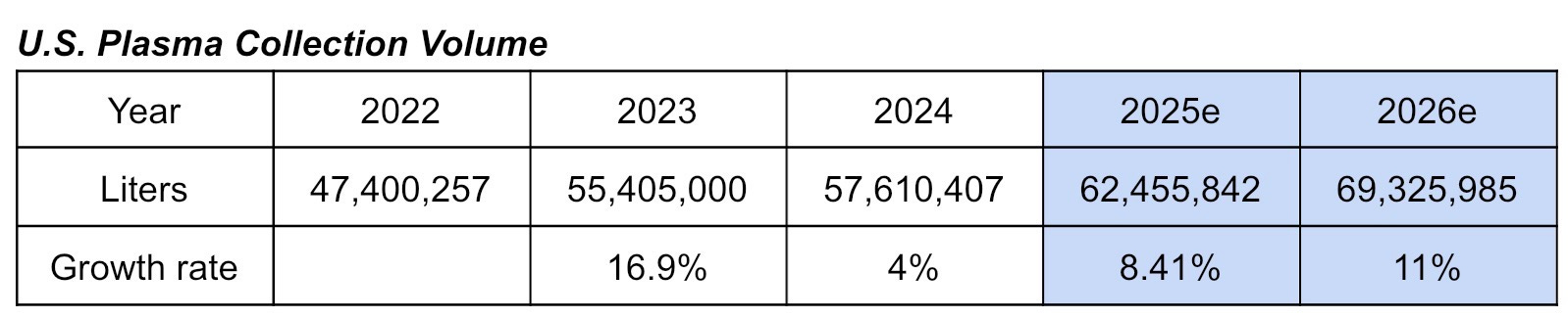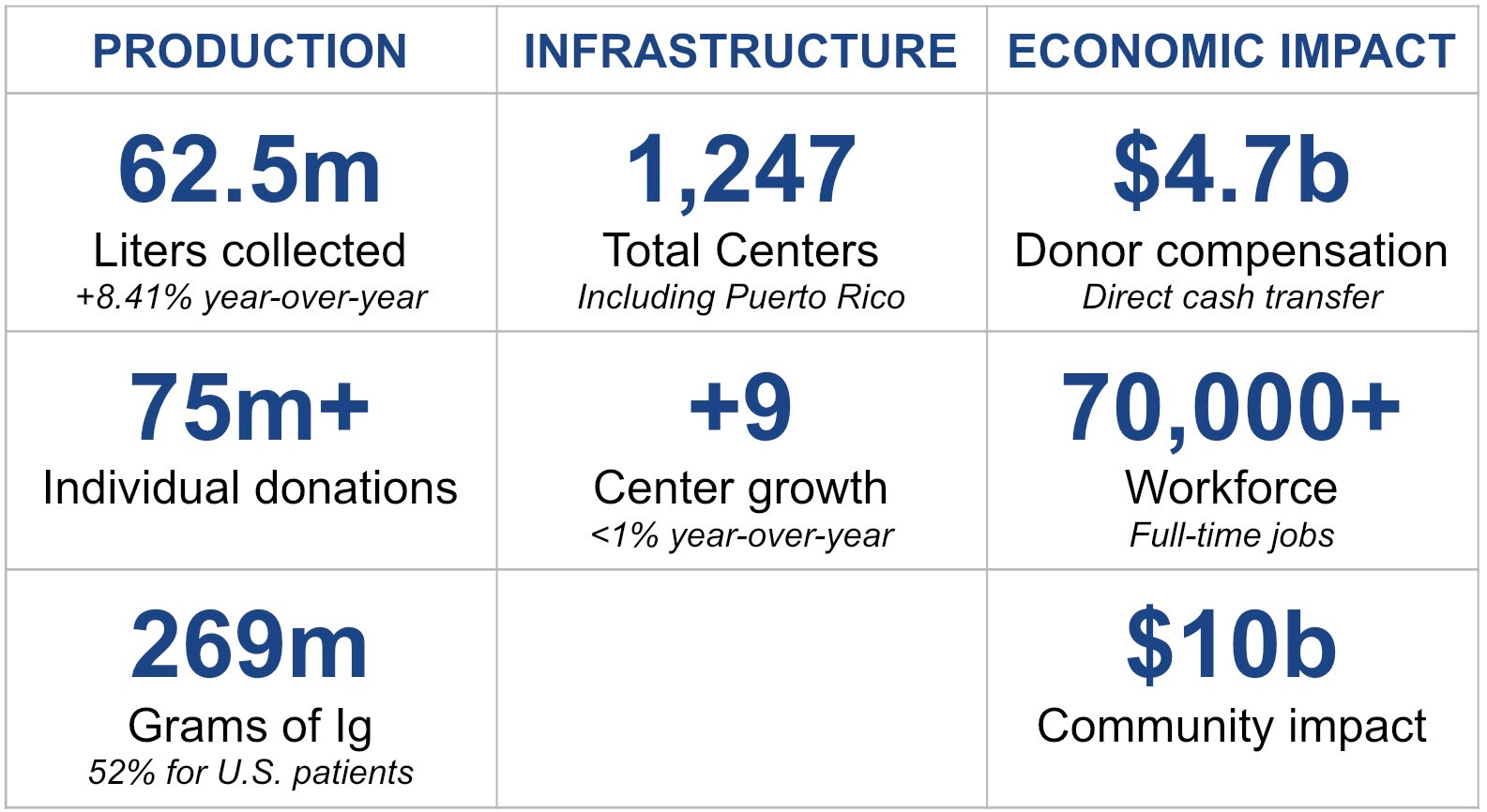 The 62.5 million liters collected in the U.S. in 2025 represents around 68% of global plasma collections for the manufacture of medicines. About 52% of those collections will end up in medicines to treat American patients, while the remaining 48% will end up treating patients in the rest of the world.