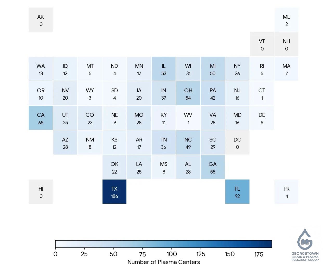 With 186 centers, Texas is home to the most plasma collection centers, followed by Florida with 92 and California with 65. Rounding out the top-5 are Georgia with 55 and Ohio with 54.